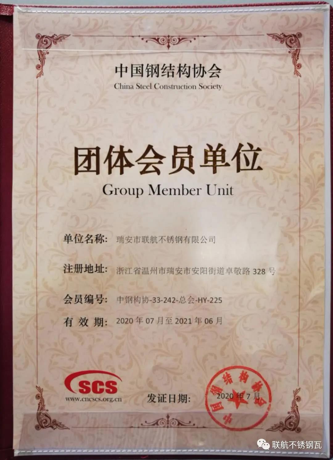 聯(lián)航不銹鋼榮任中國鋼結(jié)構(gòu)協(xié)會會員單位